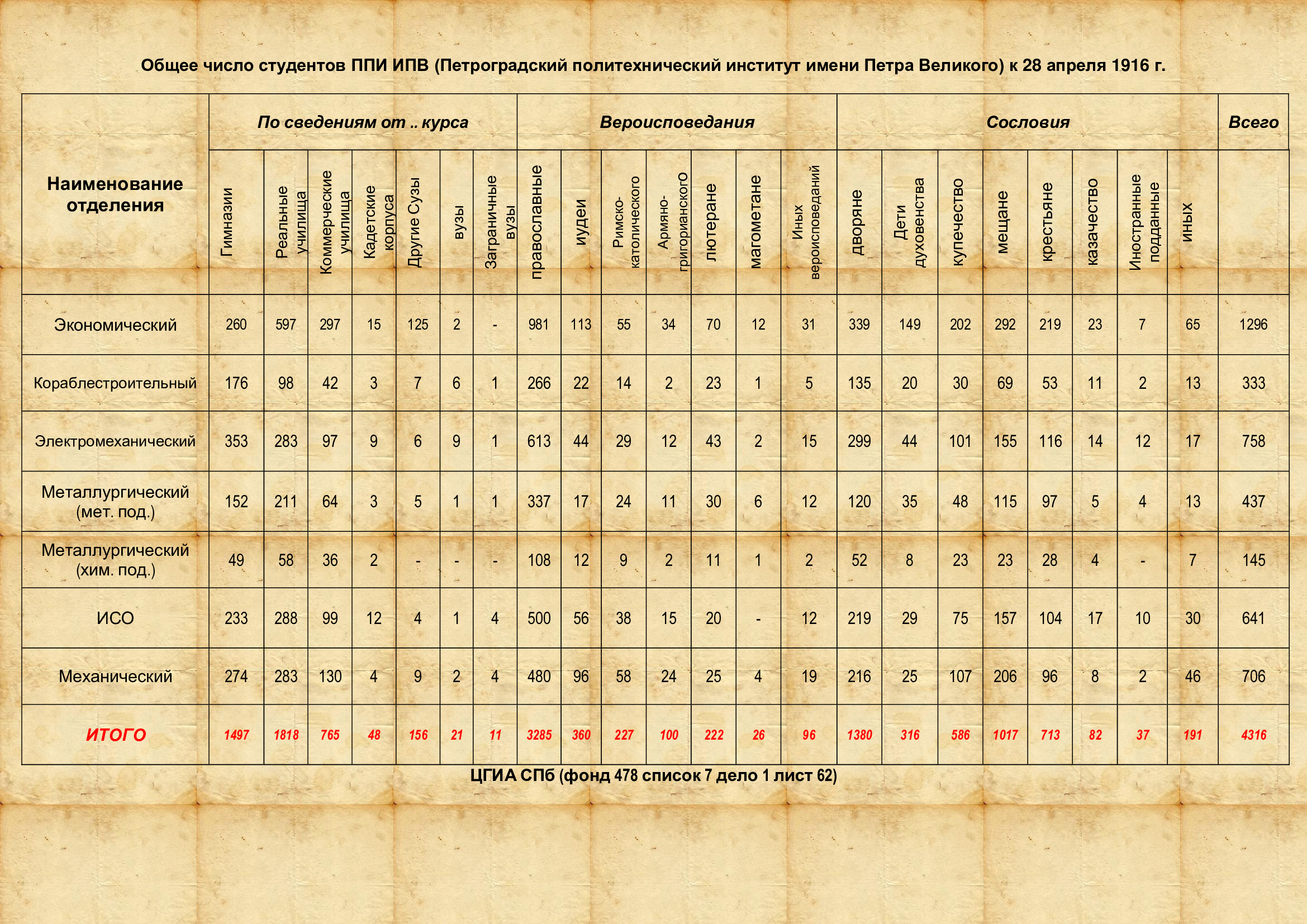 Студент начала XX века – внесословный молодой человек, который занимает активную, во всех отношениях, жизненную позицию. Сохранились данные о составе студентов Политехнического института на начало века (1916 г.)