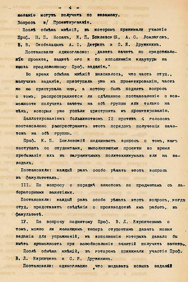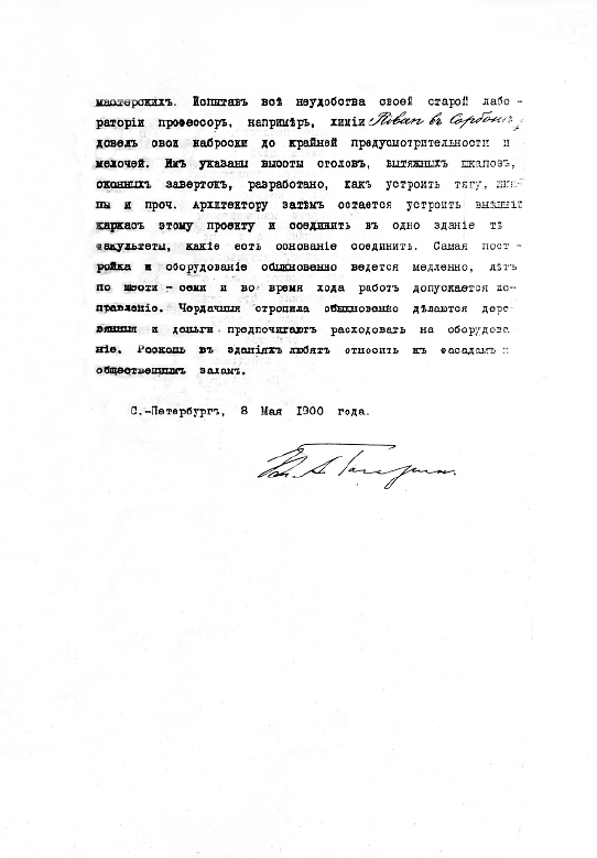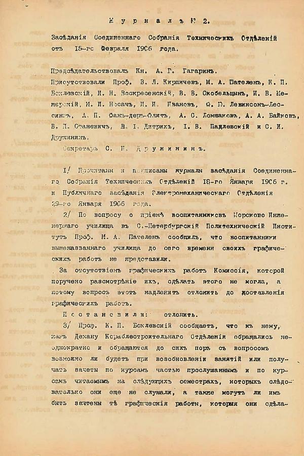 Сразу после назначения директора, который возглавил и строительную комиссию, был избран и «архитектор-строитель» - Э.Ф. Виррих. 8 января 1900 г. состоялось первое заседание «Особой строительной комиссии» в присутствии, назначенного на должность директора, князя А.Г. Гагарина, которому был представлен отчет за 1899 г. Члены Особой Строительной Комиссии вели журнал заседаний. Приведем запись от 12.04.1899: «… в проектируемом Политехникуме четыре отделения: коммерческое (первоначально еще не экономическое) с 4 летним курсом обучения, кораблестроительное, электромеханическое, металлургическое с 5 летним курсом обучения».