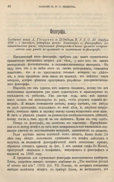 1890 – можно считать годом «рождения» фонографа А.Г. Гагарина. О своем изобретении он «доложил» на заседании во II Отделе Императорского Русского Технического Общества, доклад был опубликован в Записках И.Р.Т.О. «во I I Отдѣлѣ 22 декабря 1890 г.»